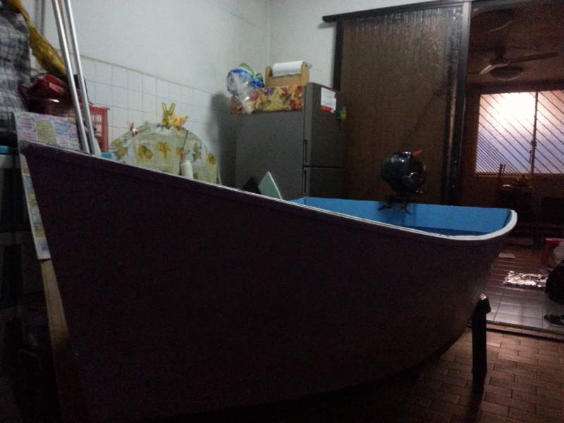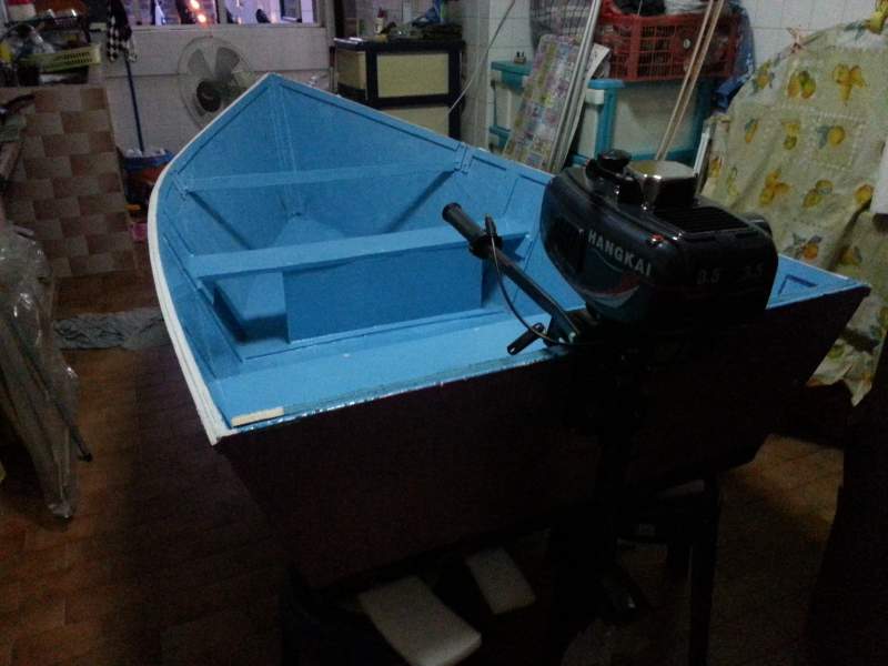 Length 7.6ft , beam 4.ft, displacement 10cm. Marine grade plywood with resin